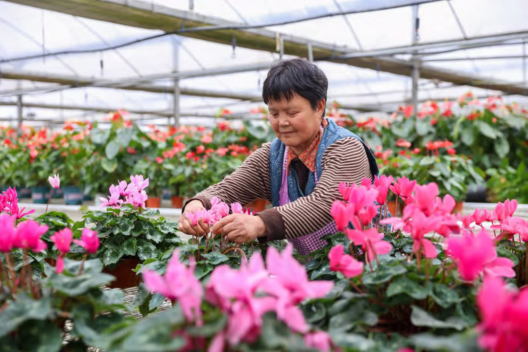 2月26日,德清加州农旅发展有限公司花卉大棚内春意盎然。工人们正忙着搬运花盆、精心管护花卉,绘就了一幅生机勃勃的春日图景。