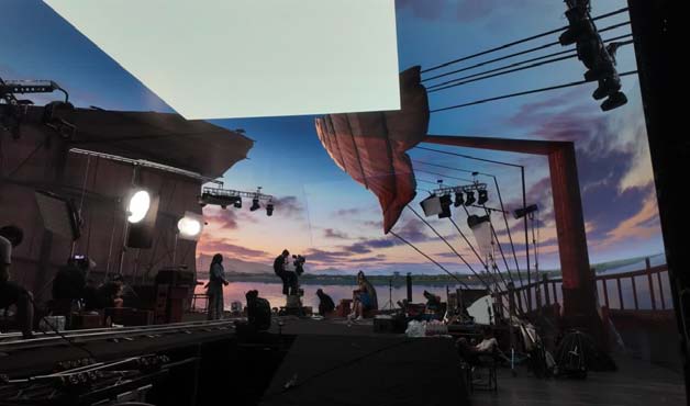 在50米直径的巨幕影棚,由2.66万块LED屏幕组成6亿像素实时渲染的“超级巨幕系统”,在此次拍摄中承担了全片最宏大、最有视觉冲击力以及人物走位调动最复杂的场景。